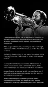 Este sábado 21 de febrero se confirmó el fallecimiento del salsero Willie Colón. Por medio de su página de Facebook, los familiares del artista expresaron. “Es con profunda tristeza que anunciamos el fallecimiento de nuestro amado esposo, padre y reconocido músico”.